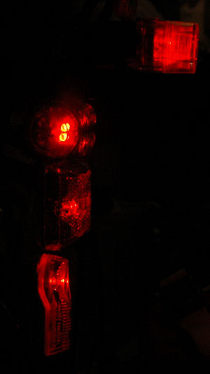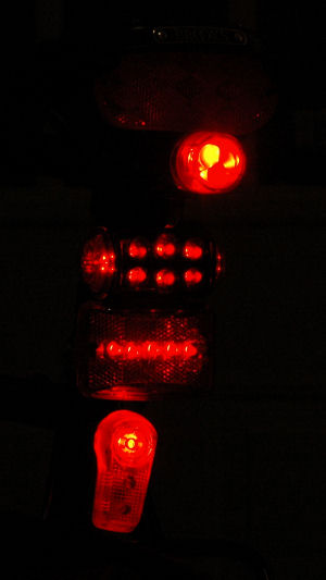 On each photo, we see from top to bottom: the BLT Rear Super Doppler, the Cateye TD-LD1000, the Vistalite Super Nebula and the Planet Bike Superflash.