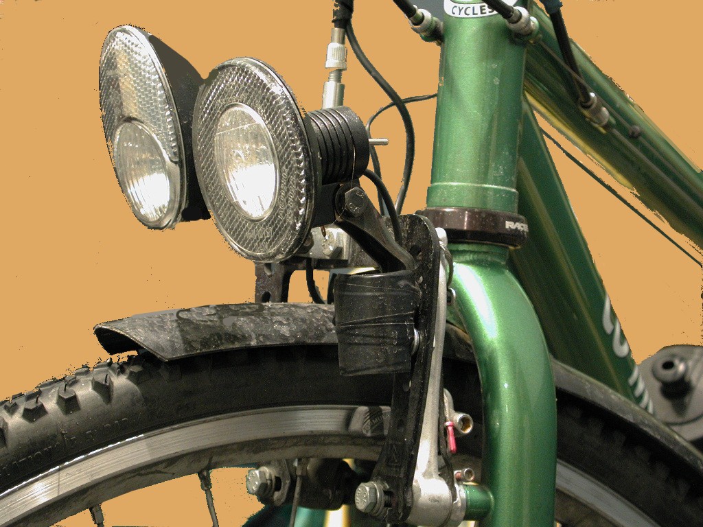 The dual headlights as installed on the Trek 520 touring bike and the Co-Motion tandem. The main headlight (on the left – closest side of the photo) is a Schmidt E-6 with a 3 W bulb. The secondary headlight is a Lumotec.