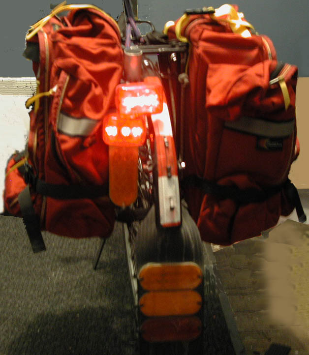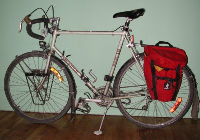 Voici mon vélo de cyclotourisme, tel qu’un automobiliste le verrait sur la route. On y voit la bavette, les réflecteurs et le matériau réfléchissant.